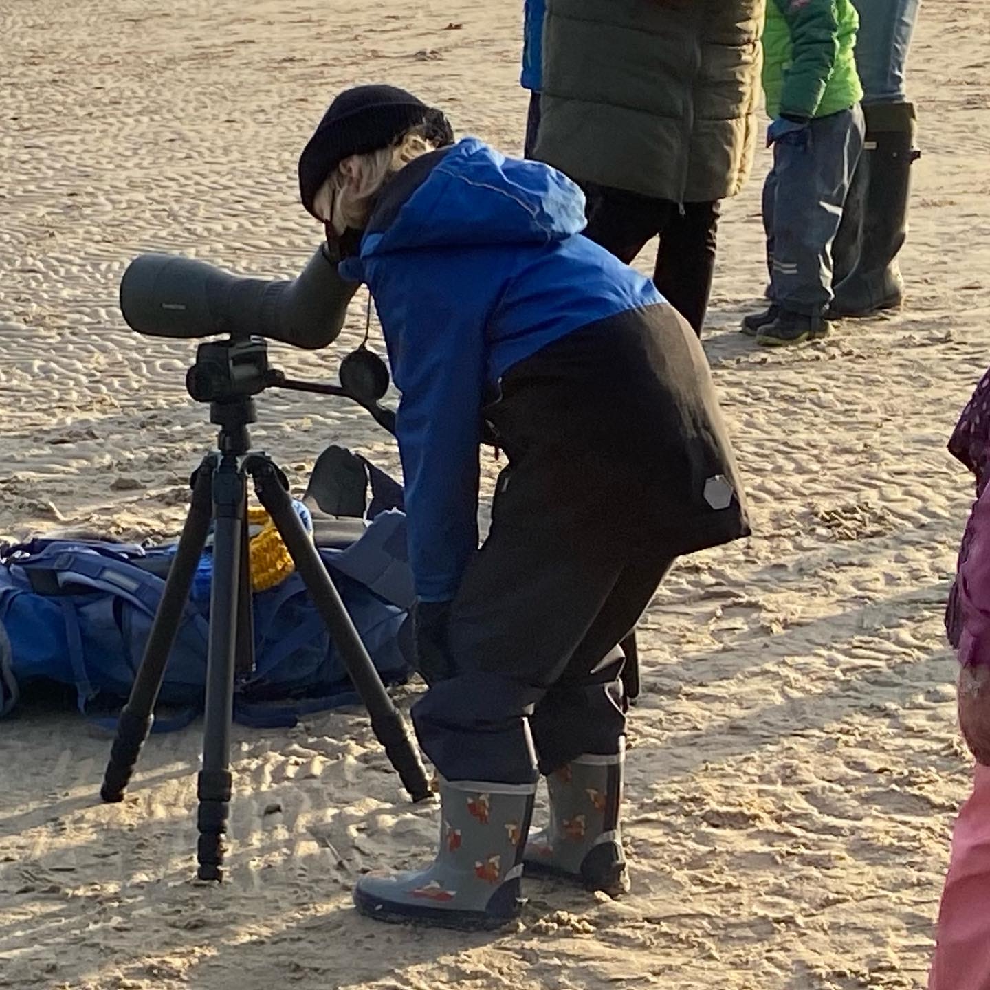 Das Spektiv stellen wir auf die Augenhöhe der Kinder ein und erforschen mit Ihnen erst ohne Hilfsmittel – dann mit Hilfsmittel die Landschaft vor uns. Mal schauen, wer welche Vögel und Nicht-Vögel erkennt.